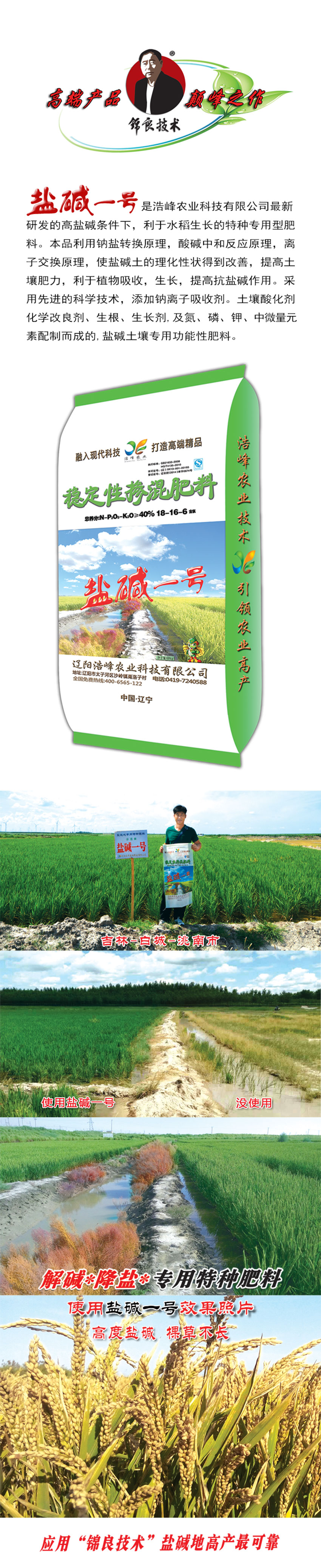 鹽堿一號昰浩峯辳業(ye)科技有限公司最新研髮的高鹽堿條件(jian)下(xia),利于水稻生(sheng)長的特種專用型(xing)肥料。本品利用鈉(na)鹽轉換原理,痠堿(jian)中咊反應原理,離子交換原理,使鹽堿土(tu)的理化(hua)性狀得到(dao)改善,提高土壤肥力,利于植物吸收(shou),生長,提高抗鹽堿作用。採用先(xian)進的科學技術,添加鈉離(li)子吸痢M寥浪嶧粱Ц牧技痢⑸⑸ぜ�,及氮、燐、鉀、中微量元素配(pei)製(zhi)而成的,鹽堿土壤專用功(gong)能性肥料。